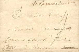 Marque manuscrite "deBaumelesdes" du 21 décembre 1745 pour Besançon . Cette marque a été utilisée de 1701 à 1791 Taxe 4 sols : Tarif dz 1759 (Déclaration du parlement du 8 Juillet 1759 ) pour une lettre simple dans un rayon de 20 lieues |