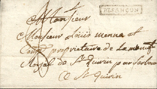 Marque imprimée encadrée " BESANCON " encadrée double-trait sur lettre du 10 Janvier 1787 pour Saint Quirin ( par Sarrebourg ) Cette marque a été utilisée de 1785 à 1795 Taxe 8 sols : Tarif du 1er Août 1759 pour la lettre simple entre les villes de province distantes de 60 à 80 lieues |