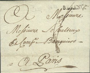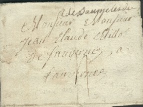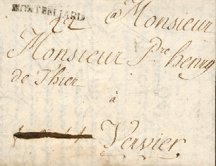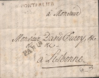 Marque imprimée Lenain N° 3 " PONTARLIER " sur lettre de Neuchatel du 25 Janvier 1784 pour Lisbonne. La lettre a transité par Pontarlier Cette marque a été utilisée de 1776 à 1791 La voie utilisée ( terre ou mer ) n'est pas visible, la taxe non plus ! |