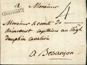 Marque imprimée Lenain N° 2 " QUINGEY " sur lettre du 23 mai 1788 Cette marque a été utilisée de 1766 à 1789 Taxe 4 sols Tarif du 1er Août 1759 pour la lettre simple entre deux villes de province jusqu'à 20 lieues inclus |