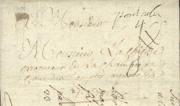 | Marque manuscrite " pontarlier " sur lettre du 8 Mars 1746 pour Dole Taxe 4 sols : Taruf de 1704 por la lettre simple entre les villes de province distantes de 20 à 40 lieues |